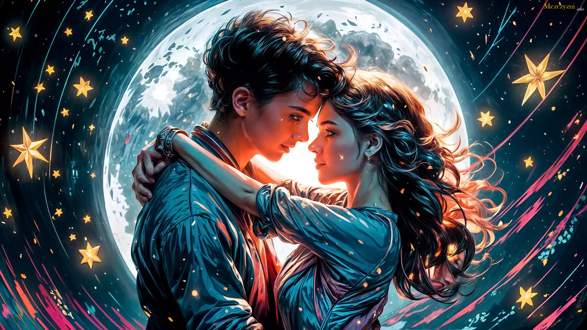 Zakochani, Księżyc, Gwiazdy, Niebo, Kobieta, Mężczyzna, Grafika