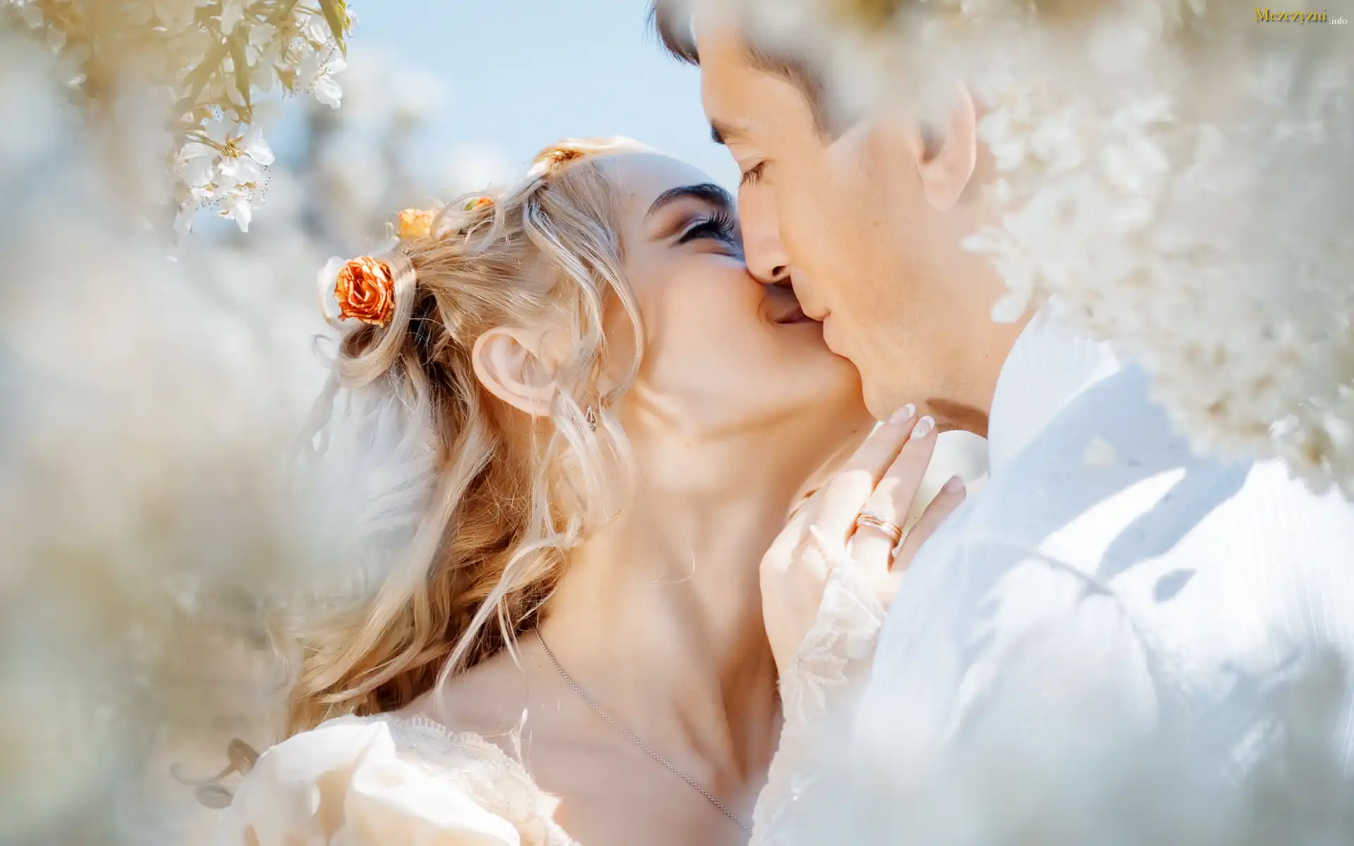 Nowożeńcy, Ślub, Pocałunek, Kwitnące, Gałęzie
