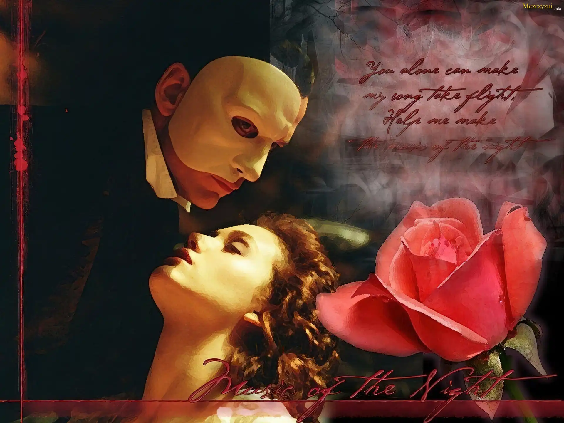 róża, Phantom Of The Opera, Gerard Butler, Emmy Rossum, maska, napis