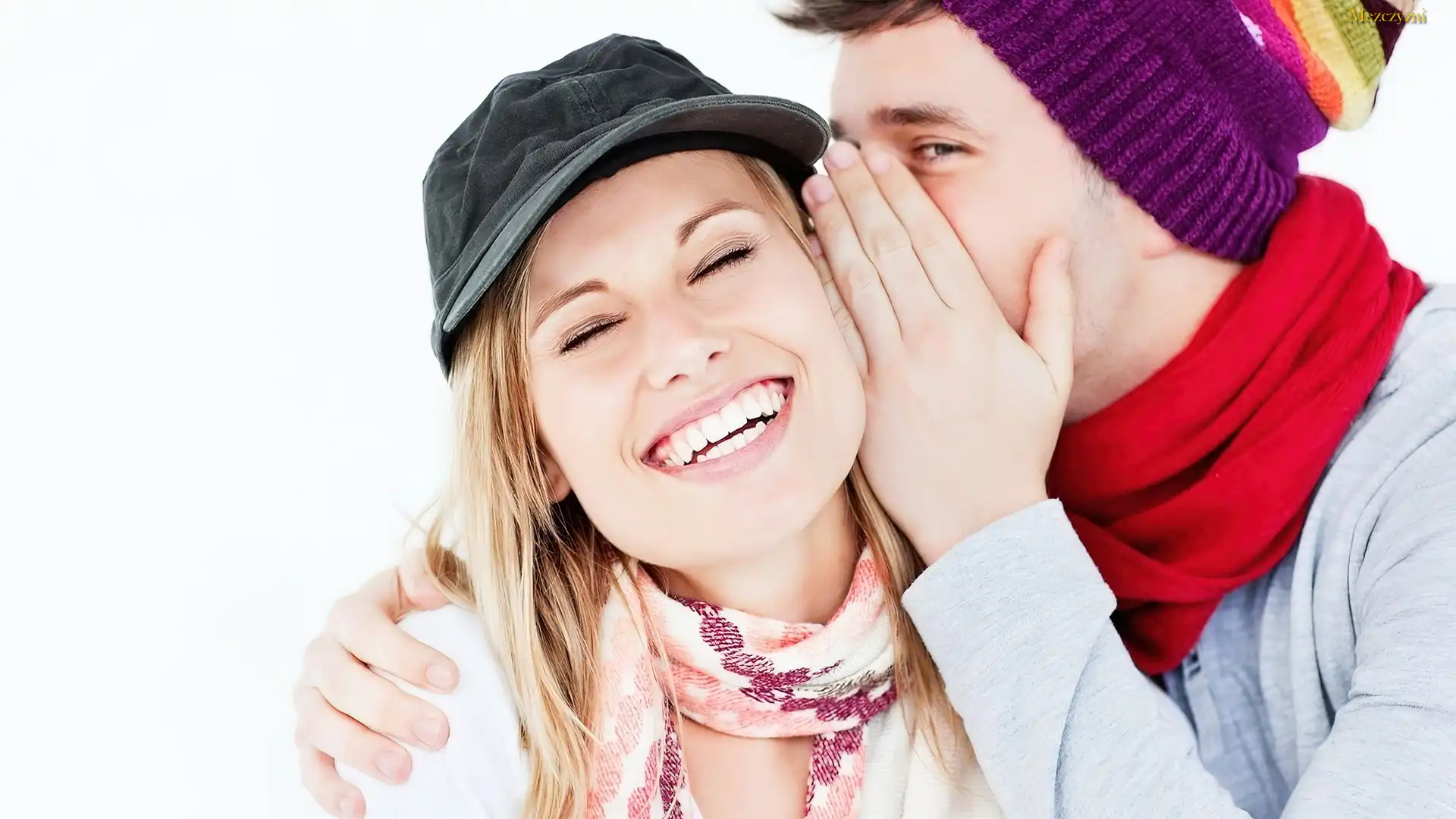 Para, Przyjaźń, Uśmiech, Sekret, Spojrzenie, Czapki
