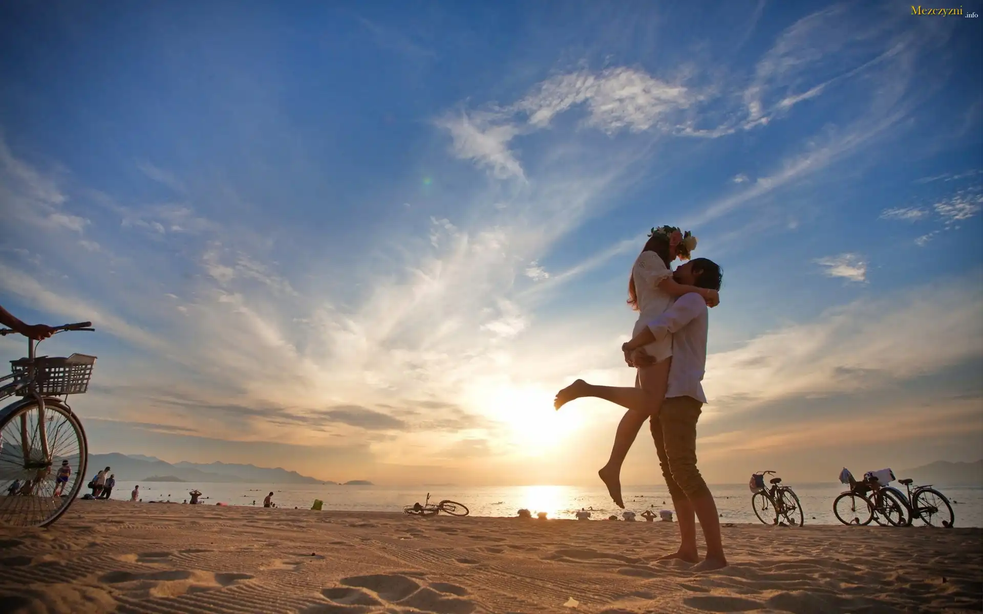 Zakochana, Para, Plaża, Rowery, Ludzie, Morze, Chmury