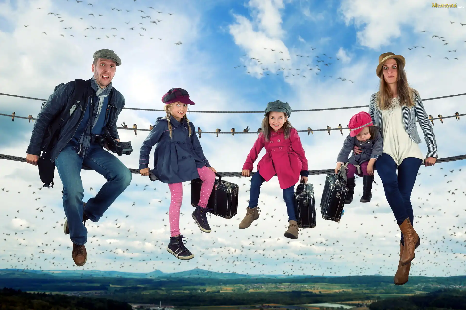 Rodzina, Dzieci, Ptaki, Niebo, Chmury