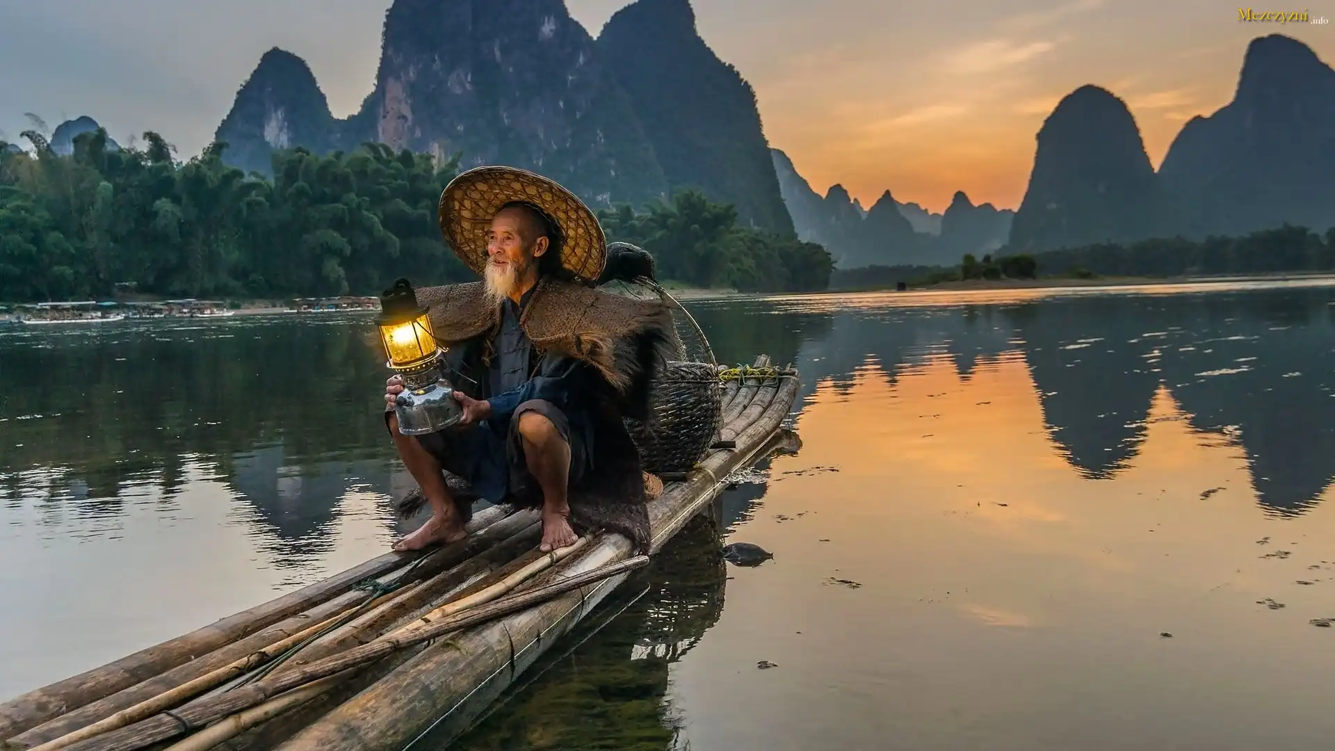 Góry, Rzeka, Łódka, Stary, Człowiek, Starzec, Lampa