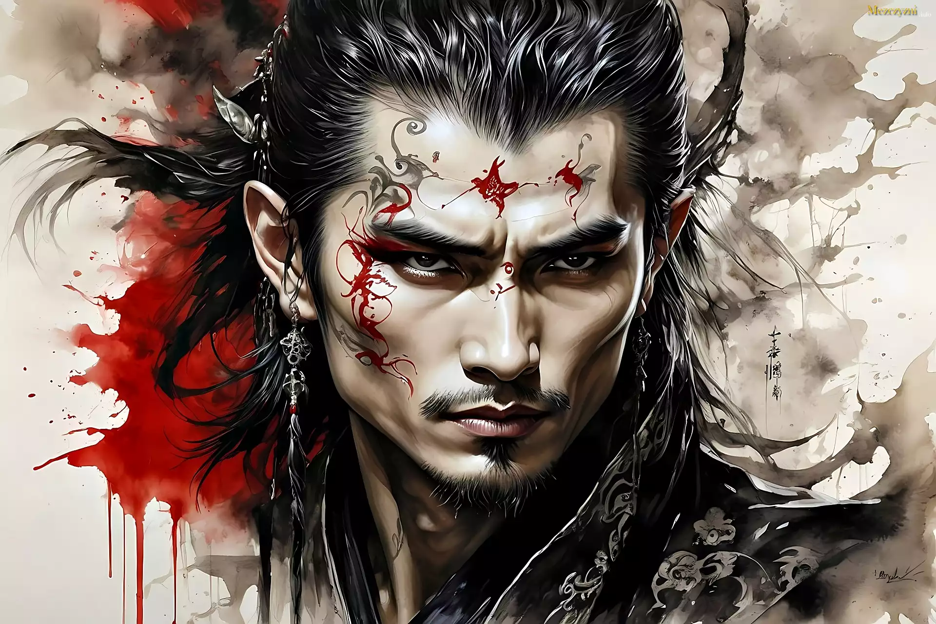 Mężczyzna, Wojownik, Azjata, Akwarela, Grafika